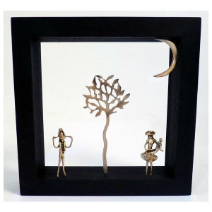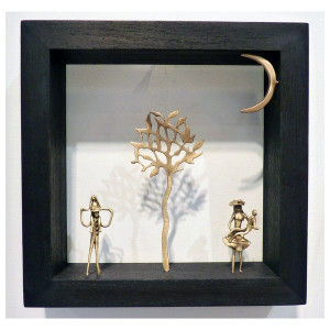 Cette sculpture en bronze entourée d'un cadre noir en bois, est une création unique et originale de l'artiste grec Georges Roumanas. Elle représente une famille heureuse dont les membres sont autour d'un arbre qui symbolise la vie et la paix.