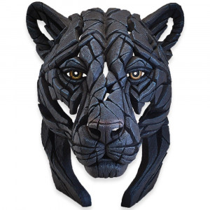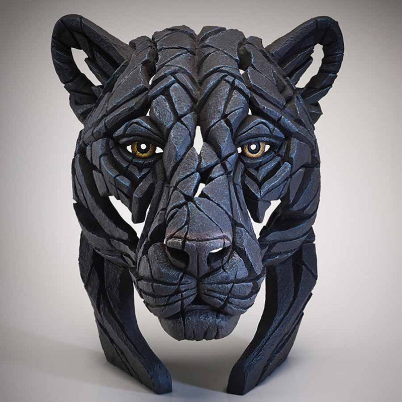 Cette sculpture animalière contemporaine, aux lignes modernes et graphiques, représente une tête de panthère noire. Il s'agit d'une création originale du sculpteur anglais Matt Buckley / atelier Edge.