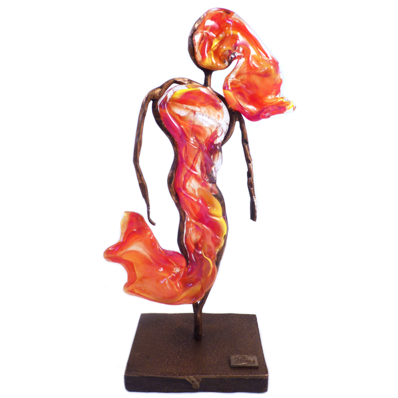 Cette sculpture rend hommage à l'artiste français Yves Lohé. Le verre, associé au bronze, apporte légèreté, transparence et couleurs à cette pièce unique.