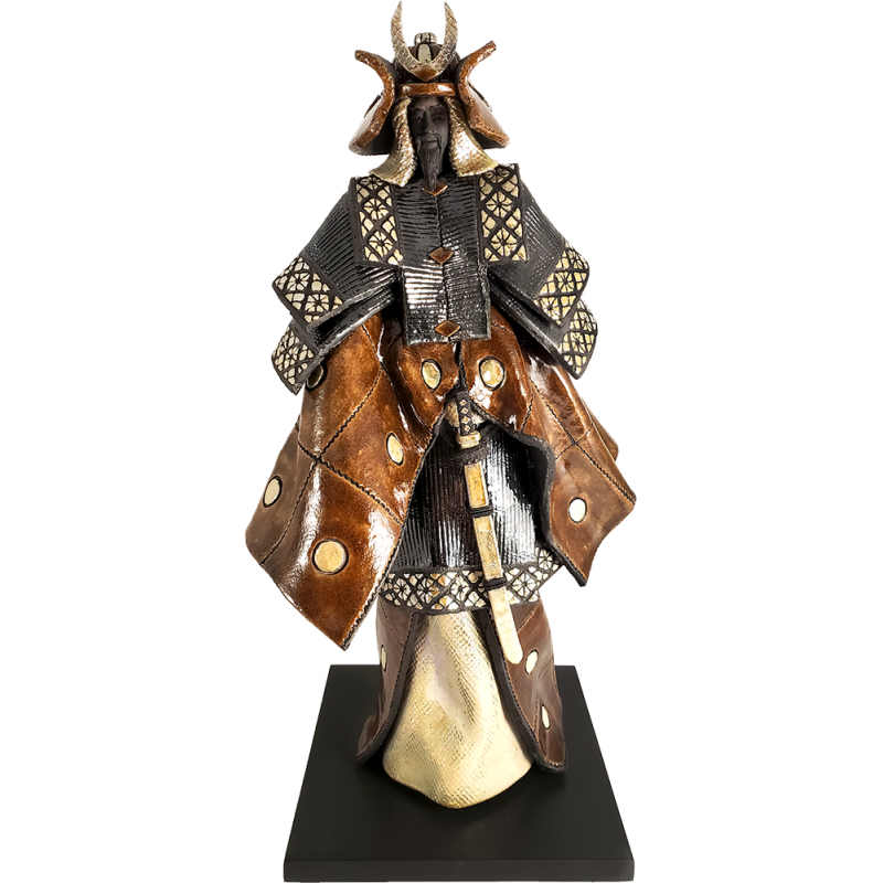 Cette pièce unique en céramique cuite selon la technique du raku a été réalisée par l'artiste Paul Beckrich. Cet impressionnant guerrier japonais a été réalisé entièrement à la main. On jurerait voir des pièces de cuir lacées les unes aux autres sur son armure, qui n'est pourtant faite que de céramique.