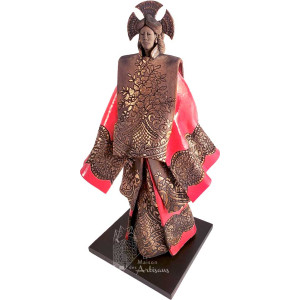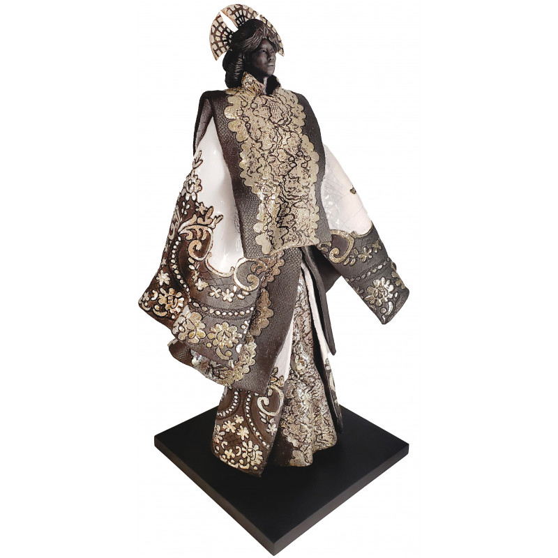 Cette très belle pièce en céramique cuite façon raku réalisée par l'artiste Paul Beckrich offre un jeu de relief et un émail blanc et doré sublimes. L'émotion transmise lorsqu'on contemple cette sculpture est dû à une grande finesse de réalisation. Elle est inspirée des élégantes Geishas, artistes et dames de compagnie japonaises qui excellent dans les arts traditionnels.