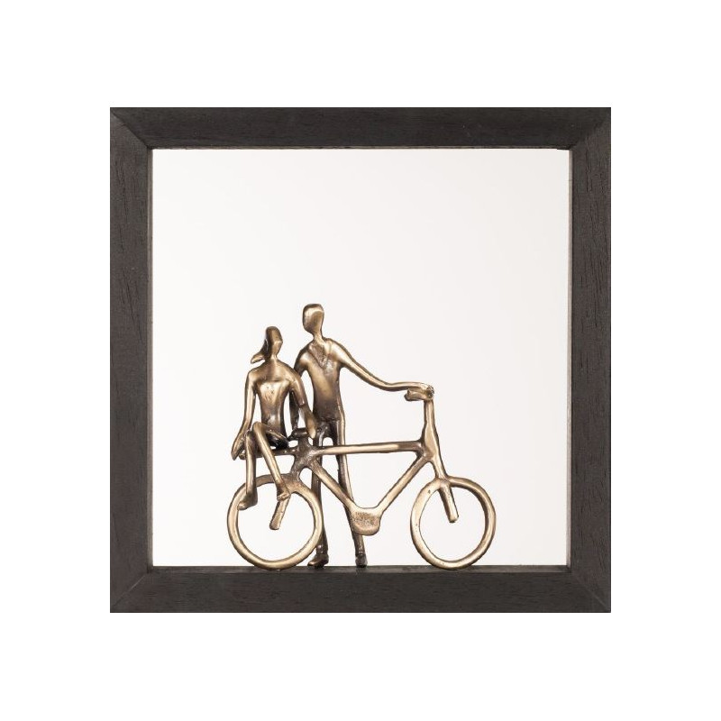 Cette sculpture en bronze entourée d'un cadre noir en bois, est une création unique et originale entièrement réalisée à la main par l'artiste grec Georges Roumanas. Elle représente un couple se promenant à vélo.