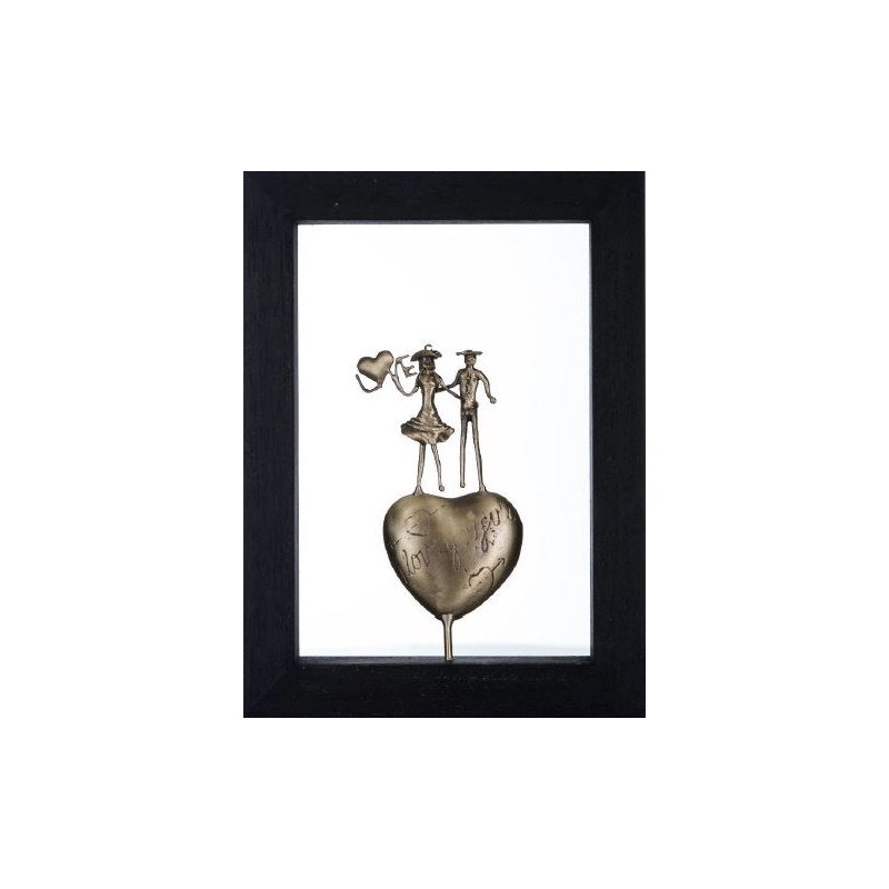 Cette sculpture en bronze entourée d'un cadre noir en bois peint, est une création unique et originale entièrement réalisée à la main par l'artiste grec Georges Roumanas. Elle représente deux êtres qui s'aiment et se le disent par des mots tendres. Les personnages peuvent être personnalisés sur demande: deux hommes, deux femmes.