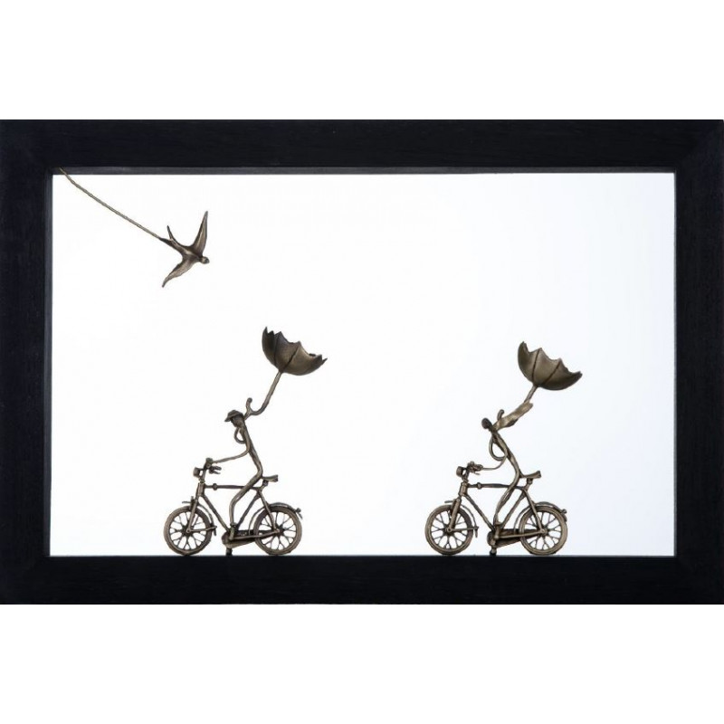 Cette sculpture en bronze entourée d'un cadre noir en bois peint, est une création unique et originale entièrement réalisée à la main par l'artiste grec Georges Roumanas. Elle représente deux personnages pressés de terminer leur promenade à vélo, car une tempête arrive.