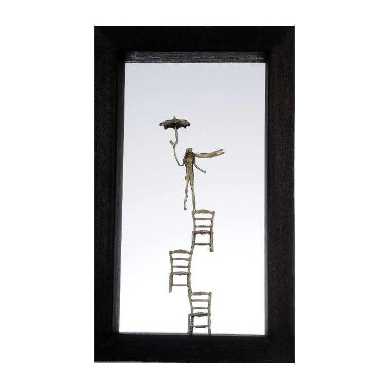 Cette sculpture en bronze entourée d'un cadre noir en bois peint, est une création unique et originale entièrement réalisée à la main par l'artiste grec Georges Roumanas. Elle représente une femme tenant un parapluie et défiant les lois de la gravité, en équilibre sur 3 chaises.