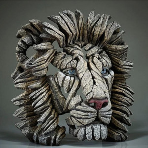 Cette sculpture contemporaine, aux lignes modernes et graphiques, représente un lion blanc majestueux. Il s'agit d'une création originale du sculpteur anglais Matt Buckley / atelier Edge.