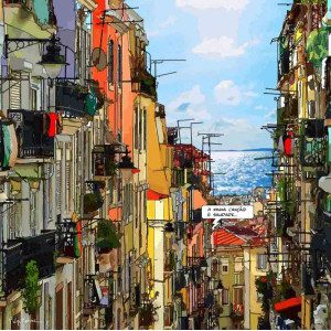 Philippe Matine nous régale avec ces jolies ambiances retravaillées dans un esprit BD. Nous pouvons admirer ici les superbes rues colorées de Lisbonne. Plus loin, s'étend la mer.