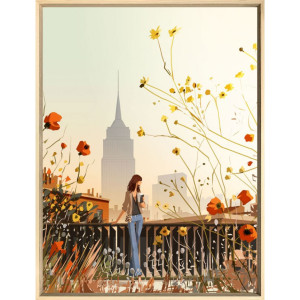 C'est sur un belvédère, entourée de fleurs, qu'une femme boit son café en admirant une vue d'automne. Cet esprit fleuri apporte fraîcheur dans un intérieur.