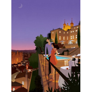 Sous un magnifique ciel pourpre, un couple admire la vue sur la ville éclairée de Lyon. Sur une table réservée dans un hôtel 5 étoiles, deux coupes de champagne les attendent... Une belle soirée romantique se profile.