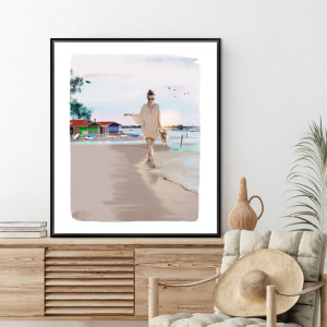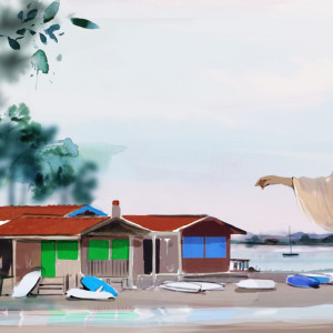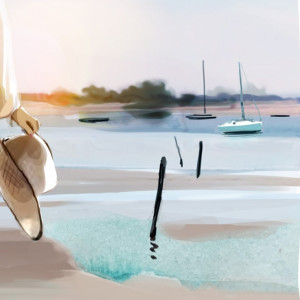 Dans cette aquarelle, Sophie Griotto nous illustre une femme, pieds nus dans le sable, caressant la liberté d'Arcachon.