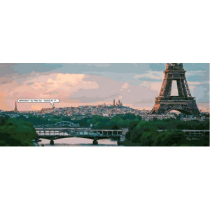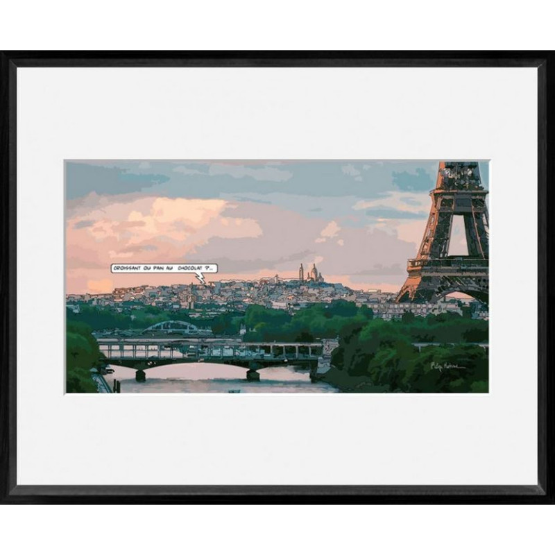 Philippe Matine nous régale avec ces jolies ambiances retravaillées dans un esprit BD. Ici, une vue sur Paris avec la Tour Eiffel et la butte Montmartre en arrière-plan. Une bulle exquise agrémente ce tableau: "Croissant ou pain au chocolat?", on ne peut plus Frenchy!