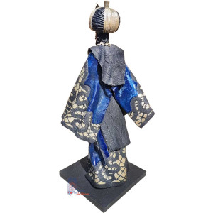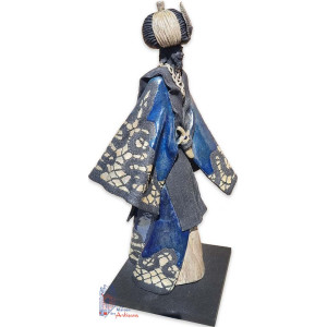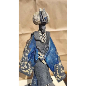 Cette très belle pièce en céramique cuite façon raku nous a été confiée par l'artiste Paul Beckrich. Son somptueux émail bleu est sublimé par la lumière. Sa coiffe est ornée d'une magnifique plume.