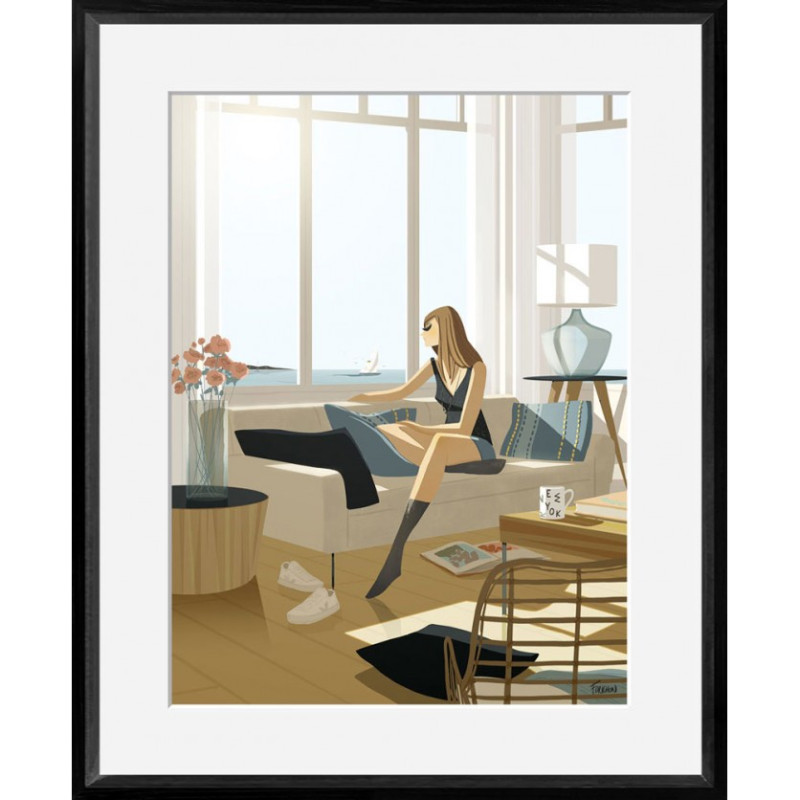 Sur un canapé, une femme profite d'un moment de calme pour prendre une pause. Par la grande baie vitrée, elle regarde au loin un voilier s'éloigner...