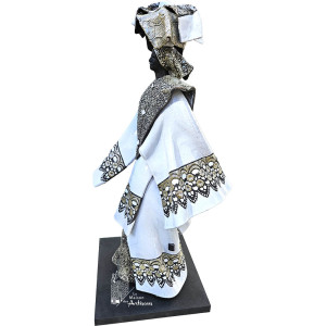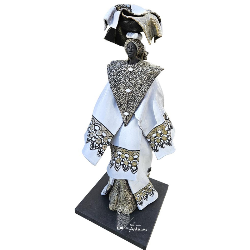 Elle représente une femme vêtue d'une magnifique tunique traditionnelle blanche et or, portant sur la tête un panier de tissus.