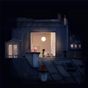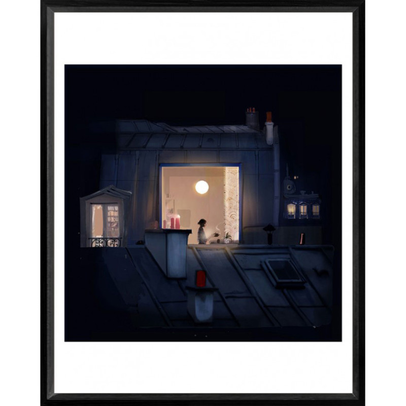 Un superbe tableau illustrant une vue sur un appartement parisien. L'intérieur semble chaleureux. Une femme s'apprête à servir un thé chaud. Les traditionnels toits en zinc parisiens, joyaux architecturaux, sont représentés.