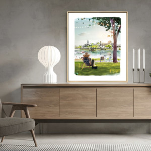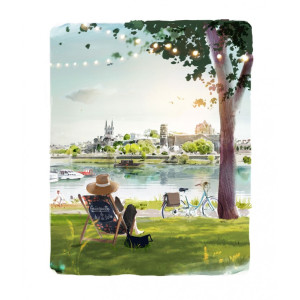 Nous sommes ravis de vous présenter ce merveilleux dessin de Sophie Griotto représentant notre belle ville d'Angers! Nous l'attendions avec impatience et nous le trouvons très réussi! Sur la cale de la Savatte, une jeune femme admire la vue sur la Maine où se dressent la cathédrale Saint-Maurice et le château d'Angers. Une ravissante atmosphère, esprit guinguette ligérienne, se dégage de ce tableau. Offrez-vous une douce pause angevine avec ce tirage d'art de grande qualité.