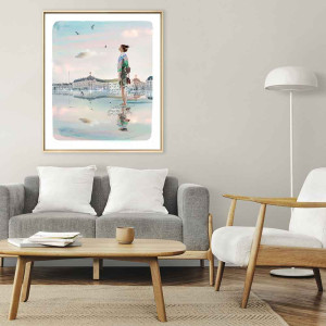 Une jeune femme bordelaise profite d'un moment calme pour s'offrir un bain de pieds dans le très connu Miroir d'Eau de Bordeaux. Elle admire le ciel, rêveuse. Le jeu des transparences et reflets est parfaitement rendu. Sophie Griotto maîtrise l'harmonie des couleurs, contribuant à l'ambiance chaleureuse et vivante de la composition.