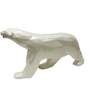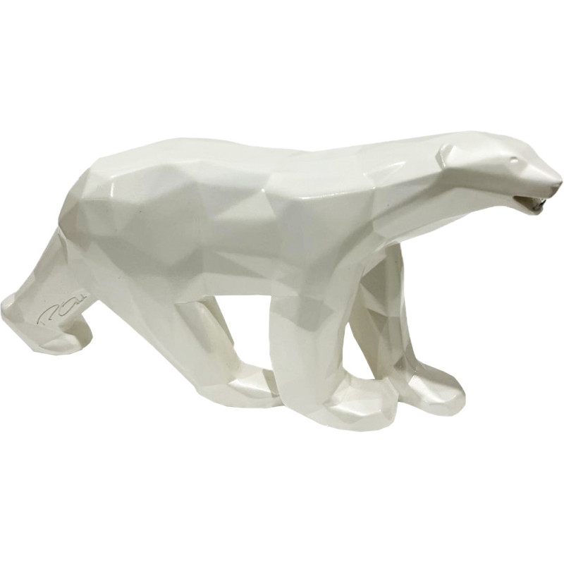 Sous sa belle robe blanche nacrée, l'ours arbore avec élégance le style multi facettes si caractéristique de l'artiste Richard Orlinski. Il dévoile ses crocs pour se différencier de l'oeuvre originale.