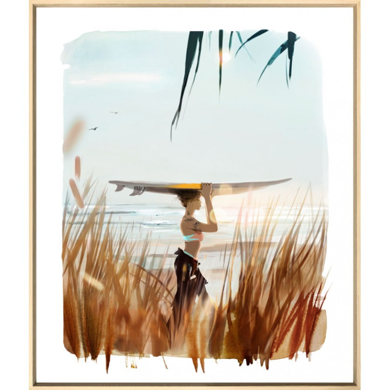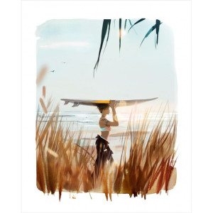 Ce superbe tirage limité de l'artiste Sophie Griotto nous transporte tout droit vert l'océan, où une jeune femme s'apprête à affronter les vagues en s'adonnant au surf. Sophie Griotto maîtrise l'harmonie des couleurs, contribuant à l'ambiance chaleureuse et vivante de la composition.