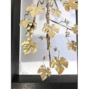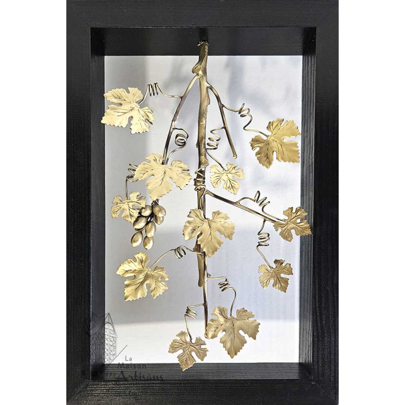 Cette sculpture en bronze entourée d'un cadre noir en bois peint, est une création unique et originale entièrement réalisée à la main par l'artiste grec Georges Roumanas. Cette déco murale représente une vigne, arbre de vie symbolisant la joie et les festivités, l'immortalité ou encore le sacrifice.