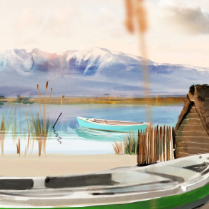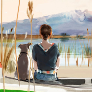 Dans une atmosphère calme et agréable, une femme et son chien admirent la vue imaginée par Sophie Griotto.