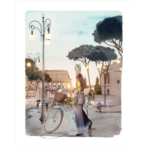Ce tableau de Sophie Griotto issu de la collection Rome présente une femme et sa bicyclette bleue. Elle est accompagnée d'un tout petit chien blanc, installé dans le panier. En arrière-plan, on aperçoit le Colisée.