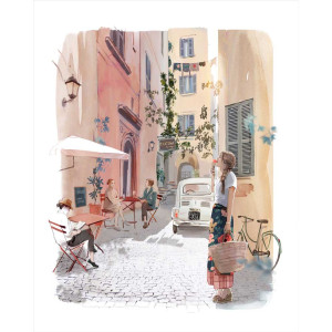 Dans ce tableau de Sophie Griotto issu de la collection Rome, une femme apprécie une glace dans le quartier de Trastevere.