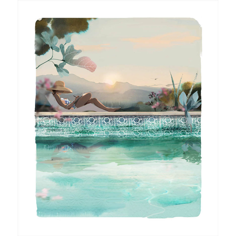 Ce tableau de Sophie Griotto est issu de la collection 2025. Il met en scène une femme en pleine pause créative, au bord d'une piscine. Au loin on aperçoit la chaîne montagneuse des Cévennes.