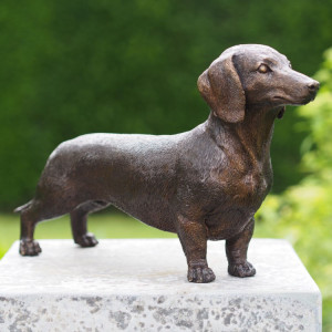 Petite sculpture extérieure ou intérieure représentant un chien teckel, en bronze massif, réalisée par l'artiste flamand Ben Wouters.