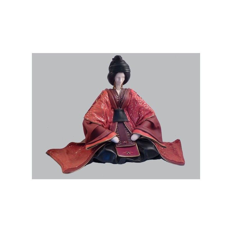 Cette sculpture de 55 centimètres de hauteur a été réalisée en cuir, par Annie Delemarle. Elle représente une geisha assise, qui porte une tenue présentant plusieurs nuances de rouge et d'orange, avec quelques détails dorés.