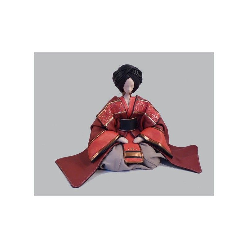 Cette sculpture de 43 centimètres de hauteur a été réalisée en cuir, par Annie Delemarle. Elle représente une geisha assise, qui porte une tenue présentant plusieurs nuances de rouge et d'orange, avec quelques détails dorés.