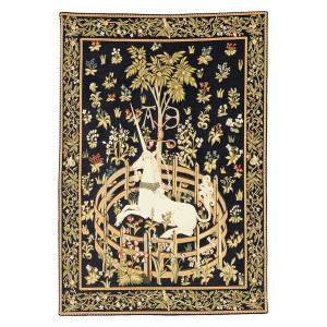 Cette tapisserie représente "La Licorne captive" qui fut tissée en Flandres vers 1500 et qui fait partie d'une série de six tentures "Chasses à la Licorne" exposées au Metropolitan Museum à New York. Le Moyen-Âge a fait de cet animal fabuleux l'emblème de la pureté. Une chaîne d'or l'attache à un arbre portant des grenades, ce qui signifie mariage et fertilité.