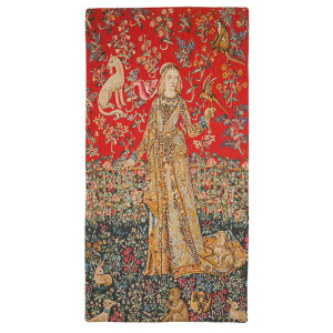 Cette tapisserie représente une partie des six célèbres tentures La Dame à la Licorne, dont cinq ont pour sujet les cinq sens. La sixième représente une dame richement vêtue, debout devant une tente que couronne un bandeau portant l’inscription « À MON SEUL DÉSIR ». Les Dames à la Licorne ont été offertes par Jean de Chabanne à Claude de Viste comme cadeau de fiançailles. Le Lion et la Licorne tenant les armoiries sont l’emblème l’un de la force, l’autre de la pureté. Ces deux animaux figurent l’union du fiancé et de la fiancée.