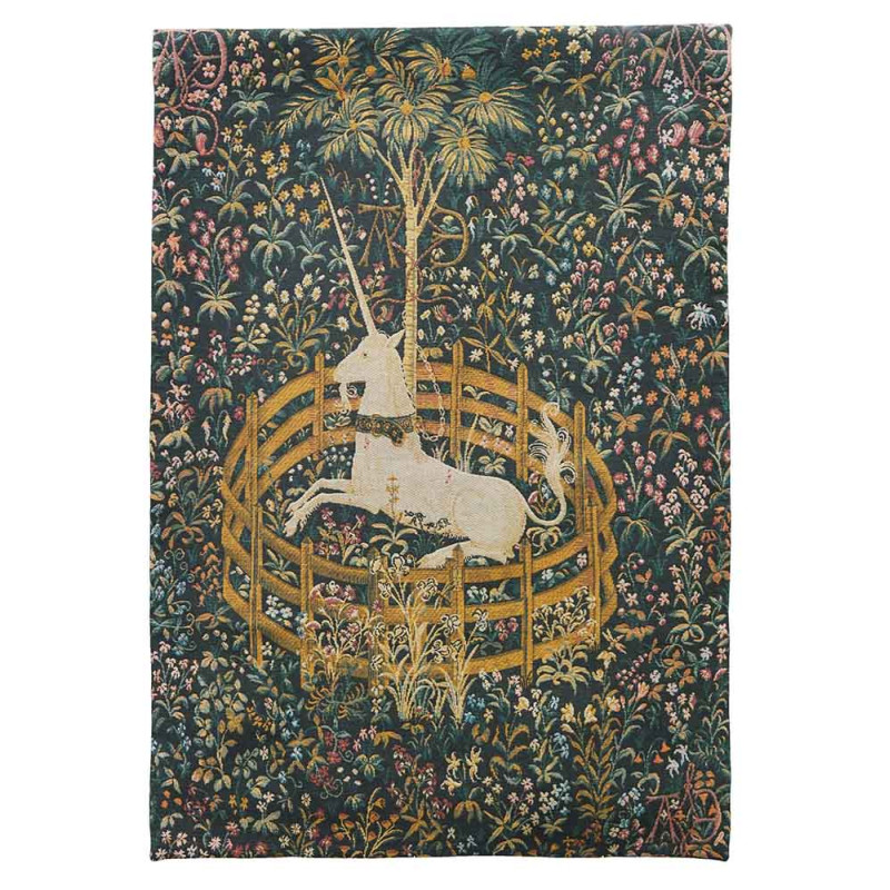 Cette tapisserie représente "La Licorne captive" qui fut tissée en Flandres vers 1500 et qui fait partie d'une série de six tentures "Chasses à la Licorne" exposées au Metropolitan Museum à New York. Le Moyen-Age a fait de cet animal fabuleux l'emblème de la pureté. Une chaîne d'or l'attache à un arbre portant des grenades, ce qui signifie mariage et fertilité.