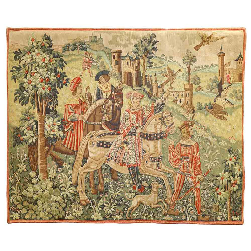 Cette tapisserie a été réalisée d’après une tenture découverte au XVIe siècle dans la région de Bordeaux, attribuée aux Ateliers des Flandres (Bruxelles) vers 1500. Cette tapisserie est exposée à l’Hôtel de Cluny (Paris). Ce chef d’oeuvre de l’art médiéval nous montre un des passe-temps favoris des seigneurs de l’époque, la chasse au faucon appelée également au XVIe siècle « plaisante chasse » ou « chasse de volerie ».