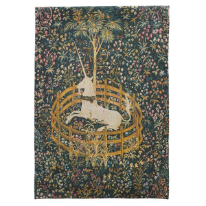 D'après une tapisserie qui représente "La Licorne captive" qui fut tissée en Flandres vers 1500 et qui fait partie d'une série de six tentures "Chasses à la Licorne" exposées au Metropolitan Museum à New York. Le Moyen-Âge a fait de cet animal fabuleux l'emblème de la pureté. Une chaîne d'or l'attache à un arbre portant des grenades, ce qui signifie mariage et fertilité.