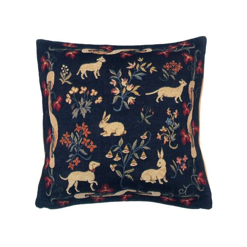 Cette belle housse de coussin tissée, comme toutes les célèbres «Mille-fleurs » du Val de Loire, nous montre une scène de la vie au Moyen-Âge. Lapins et chiens peuplent un jardin luxuriant. Ce style est représentatif de l'Art de la Tapisserie du XVème et XVIème siècle.