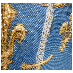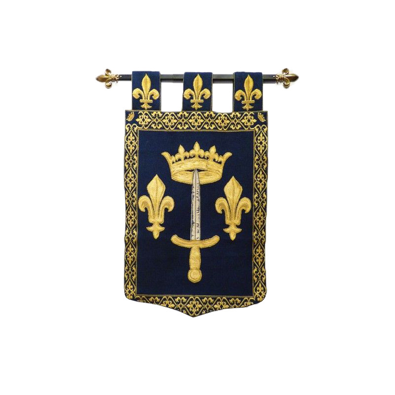 Étendard de Sainte Jeanne d'Arc avec les fleurs de lys, la couronne et l'épée.