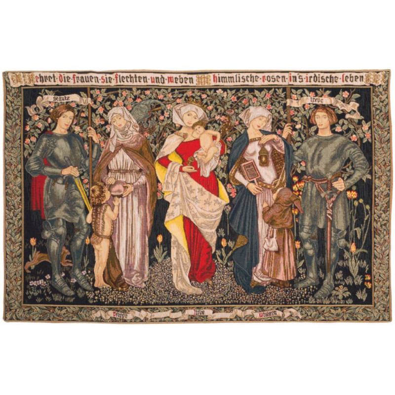Cette tapisserie se base sur le travail de Marianne Stokes (1855-1927) Morris & Co, Merton Abbey. Tapisserie originale tissée par John Martin et Gordon Berry en 1912. Cette tapisserie s’inspire d’une citation du poème de Schiller « Valeur des femmes » (1796) qui apparaît sur le bord supérieur « Honorez les femmes, elles tressent et tissent des roses célestes dans la vie terrestre ». Sous les personnages figure de gauche à droite « Courage, Soins, Amour, Sagesse et Fidélité ». Whitworth Art Gallery – Manchester.