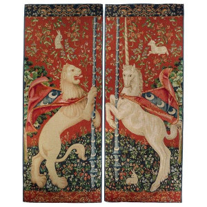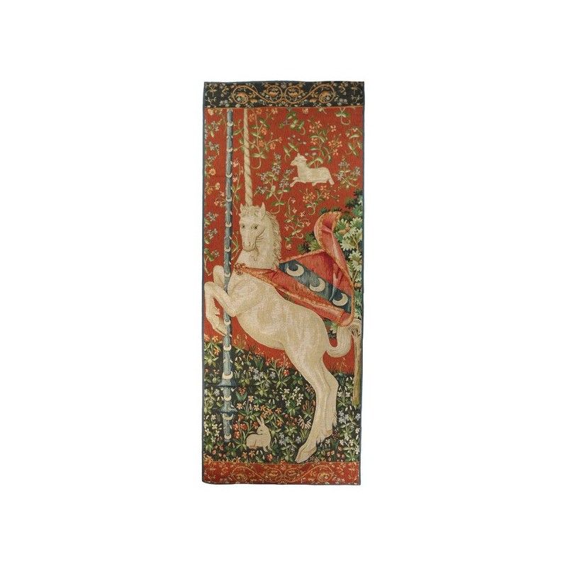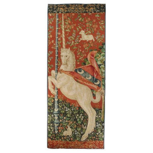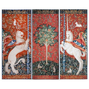 Tapisserie de la Licorne extraite de la tenture intitulée 'La Dame à la Licorne'. Cet ensemble se compose de 6 tapisseries, les scènes différentes expriment les cinq sens, la sixième tapisserie est intitulée 'A mon seul désir'. Cette tapisserie est exposée au Musée de Cluny. Toutes les tapisseries reprennent les mêmes éléments : sur une sorte d'île plantée de touffes de fleurs vivaces, de couleur bleu sombre qui contraste avec le fond rouge vermeil ou rose semé d'animaux et de branches fleuries arrachées à leur tronc, on voit une femme entourée d'emblèmes héraldiques, une licorne à droite et un lion à gauche, parfois accompagnée d'une suivante et d'autres animaux.
