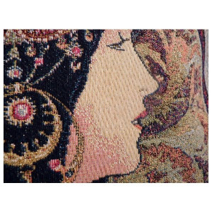 Cette housse tissée a été réalisée d'après une œuvre d'Alphonse Mucha (1860-1939), "le Maître de la Belle époque". Aucun artiste n'a autant contribué à marquer le visage de la belle Époque en France. Après avoir réalisé sa première affiche pour la célèbre actrice Sarah Bernhardt, cet artiste tchèque connut une ascension fulgurante et joua rapidement un rôle prépondérant dans le domaine du design de la Belle Époque. Dans ses œuvres, il nous présente de belles femmes et de douces plantes stylisées, formant ainsi des ornements d'une esthétique intemporelle.