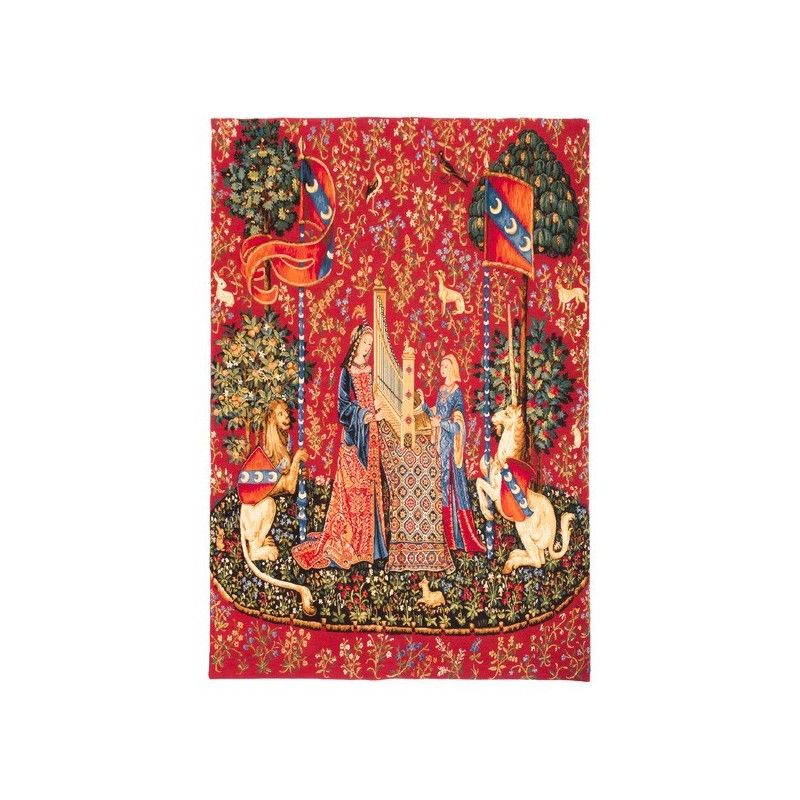 Cette tapisserie représente un extrait de la célèbre tenture intitulée "La Dame à la Licorne". Cet ensemble se compose de 6 tapisseries, les scènes différentes expriment les cinq sens, la sixième tapisserie est intitulée "à mon seul désir". Cette tapisserie est exposée au Musée de Cluny. Les Dames à la Licorne ont été offertes par Jean de Chabanne à Claude de Viste comme cadeau de fiançailles. Le Lion et la Licorne tenant les armoiries sont l’emblème l’un de la force, l’autre de la pureté. Ces deux animaux figurent l’union du fiancé et de la fiancée.
