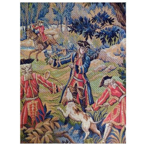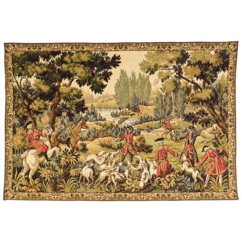 Cette tapisserie représente une scène de chasse à courre du XVIIIe siècle. Distraction noble et passe-temps favori des grands de l’époque, la chasse à courre est fréquemment illustrée dans les tapisseries de cette époque. Cette scène de chasse est l’oeuvre de Jean- Baptiste Oudry, célèbre peintre animalier très proche de la nature. Dans la forêt de Compiègne, les cavaliers préparent la meute pendant que les piqueurs sonnent du cor.