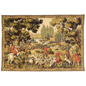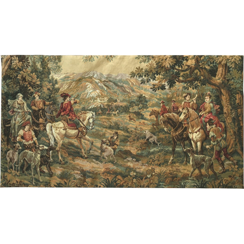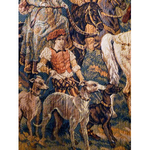 Dans cette scène représentant la tradition de la chasse à courre, le peintre Cesare-Auguste Detti s'est surtout attaché à valoriser les costumes des personnages. La scène de chasse bascule en arrière-plan. Les personnages sont vêtus "à l'italienne", les chevaux sont richement caparaçonnés et ils sont accompagnés par une meute de lévriers.
