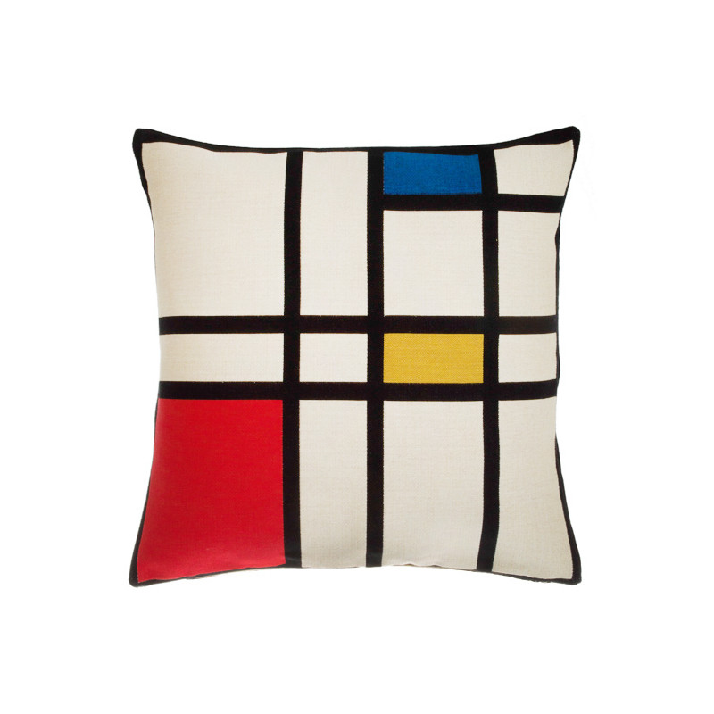 Cette housse de coussin tissée est inspirée de la célèbre oeuvre de Piet Mondriaan "Composition en rouge, jaune, bleu et noir".
