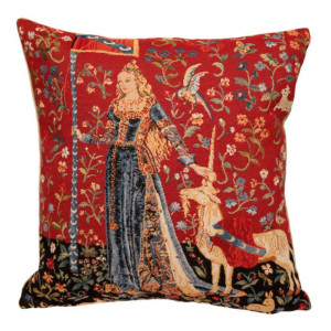 Cette housse de coussin tissée représente une petite partie des six célèbres tapisseries de la Dame à la Licorne.