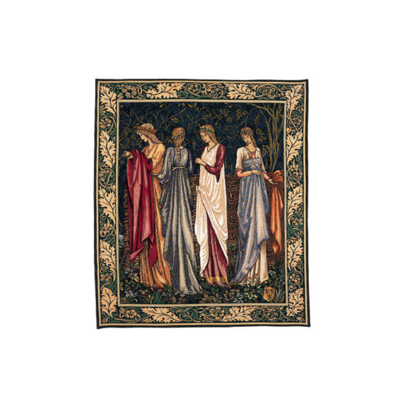 Cette tapisserie a été réalisée d’après une suite de grandes tapisseries dessinées par W. Morris et E. Burne-Jones puis tissées dans les ateliers de Morris & Company (1890-1895). Considérées comme une oeuvre majeure de l’art décoratif de la fin de l’ère victorienne, ces tapisseries illustrent la Quête du Saint-Graal. Après leur avoir remis leurs boucliers et leurs armures, les Dames de Camelot font leurs adieux aux Chevaliers de la Table Ronde.