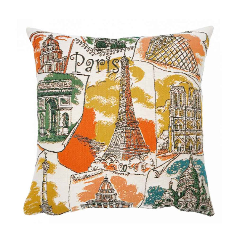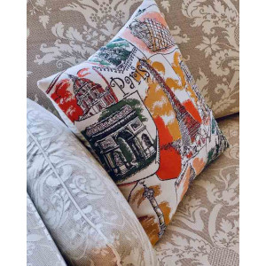 Cette housse de coussin tissée sur métier jacquard a été réalisée dans l'esprit des croquis d'un carnet de voyage. Elle regroupe les grands monuments de la capitale française. Elle se décline en deux coloris au choix.