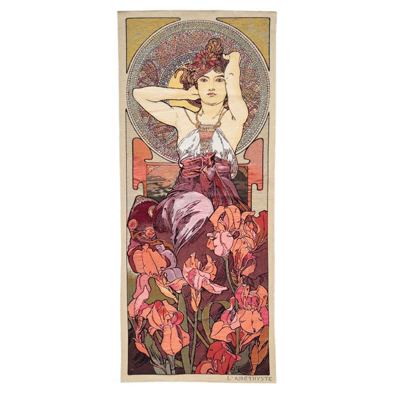 Cette sublime tapisserie murale disponible en deux tailles est une reproduction issue de la série de lithographies "Les Pierres Précieuses" réalisée par Alfons Mucha en 1900. Chaque œuvre est dédiée à une pierre précieuse spécifique: le rubis, l'émeraude, l'améthyste et le topaze. A travers la représentation de quatre femmes ornées de motifs floraux et végétaux, typiques de l'Art Nouveau, Mucha valorise l'essence de chaque pierre.