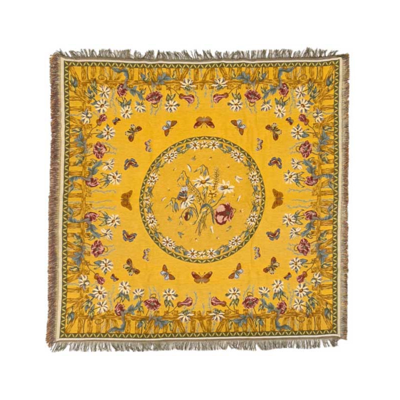 Un plaid au décor charmant et champêtre, mêlant marguerites, coquelicots et papillons sur un fond jaune très chaleureux.